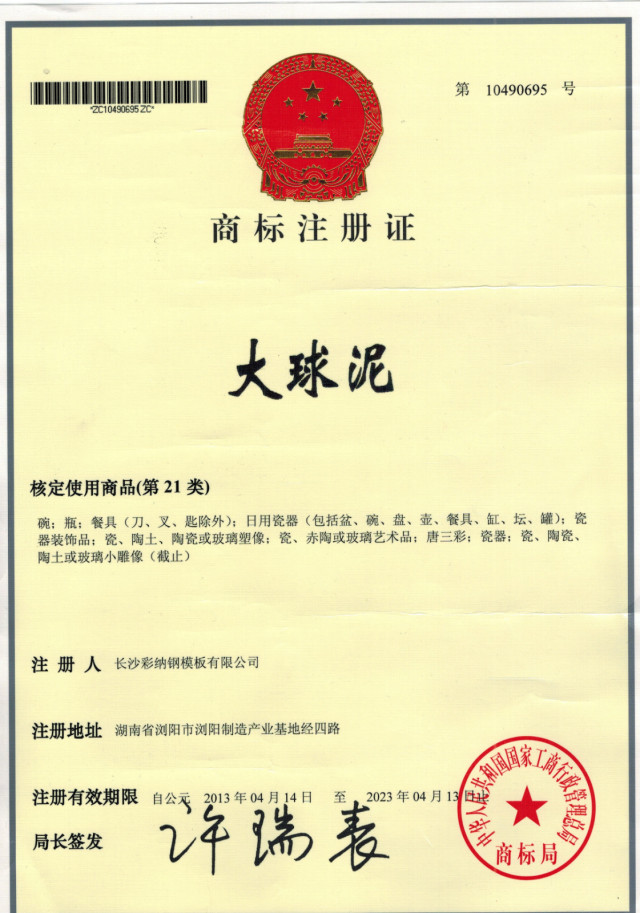 2013年5月1日,長沙彩納鋼模板有限公司(商標(biāo)使用許可人)與湖南大球泥瓷藝有限公司(商標(biāo)使用被許可人)簽訂了商標(biāo)使用授權(quán)書(許可人與被許可人兩企業(yè)為同一法人代表),從而,湖南大球泥瓷藝有限公司擁有了國家注冊21類商標(biāo)大球泥(注冊號為第10490695號)及大球泥瓷(注冊申請受理號:12394692)使用權(quán),用于生產(chǎn)或定制產(chǎn)品并銷售。