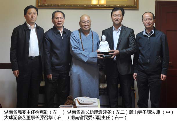 2014年11月5日上午10時許,在湖南省省長助理袁建堯、湖南省民委主任徐克勤等一行的見證下,湖南大球泥瓷藝有限公司董事長滕召華拜訪了中國佛教協(xié)會副會長兼秘書長、湖南佛教協(xié)會會長、麓山寺方丈圣輝法師,并親手將046號《多寶佛》(釋迦牟尼佛瓷塑像)捐贈給圣輝法師、永久收藏于麓山寺。