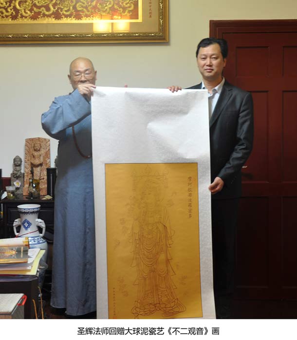 圣輝法師大贊《多寶佛》(釋迦牟尼佛瓷塑像)工藝精湛,表情細膩,是他見過的精致的瓷雕佛像。他說,大球泥瓷藝捐贈這么珍貴的佛像是在做大善事,塑造佛像、弘揚佛法更是功德無量,與佛結緣的人都會一生平安。同時,圣輝法師還將自己收藏的《不二觀音》畫回贈給大球泥瓷藝收藏。