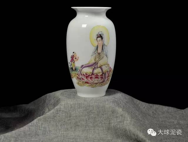 《坐蓮觀音》藕瓶,由省級工藝美術(shù)大師制作,瓶高:19厘米,口徑:8厘米,足徑:6厘米!蹲徲^音》因以大球泥為主要原料制成,故瓶體晶瑩剔透,畫面特別溫潤。細(xì)細(xì)觀察,在燈光的照射下,藕瓶泛著淡淡的青光,好似深秋一輪皓月,恬靜、溫潤。其作品刻畫出來的觀音菩薩有著雍容智慧、悲憫天下的儀態(tài)。而觀音和蓮花歷來是藝術(shù)大師在創(chuàng)作中所喜愛的題材,二者結(jié)合,寓意美好,表現(xiàn)出了對于幸福美好生活的向往。如今,人們對瓷器藝術(shù)品更加重視瓷器的品質(zhì)與美感,還有其藝術(shù)價值。大球泥因它本身的材質(zhì),煅燒出了釉面晶瑩、胎質(zhì)堅硬的優(yōu)質(zhì)瓷。