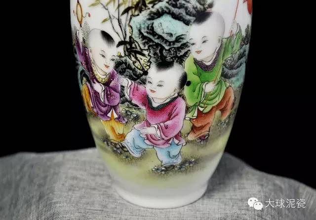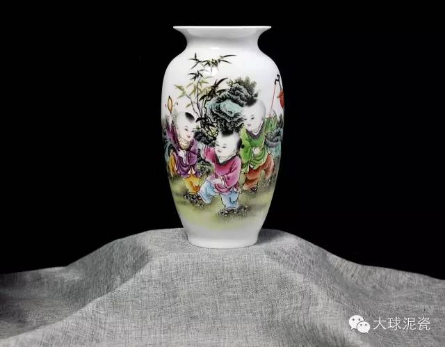 《歡天喜地》藕瓶,以大球泥為主要原材料,景德鎮(zhèn)省級(jí)工藝美術(shù)大師創(chuàng)作,與釉上粉彩工藝相結(jié)合,使得瓷器上的圖案,豐富多彩,色澤鮮艷,立體感強(qiáng)。