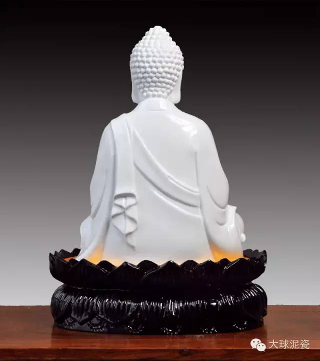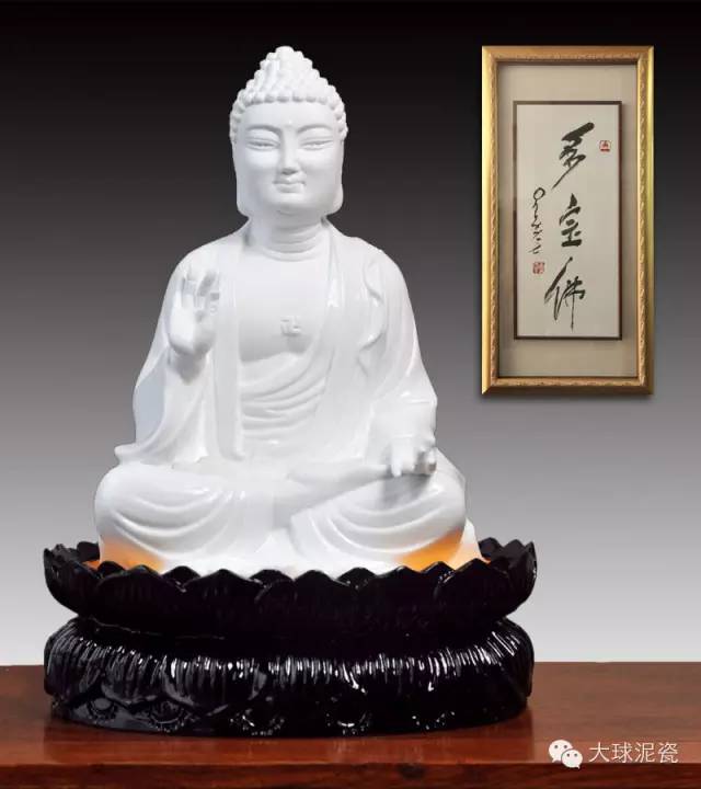 《釋迦牟尼佛瓷塑像》,面相慈善莊嚴(yán),表情靜穆柔和;右手結(jié)觸地印,意為降伏群魔,左手結(jié)禪定。话私琼殢浉吲_(tái)上承放蓮花寶座,釋迦牟尼佛坐于其上,合目俯首,胸飾凸雕的擅字,法相莊嚴(yán)沉靜,神態(tài)極為逼真。充分顯示了佛祖莊嚴(yán)肅穆,慈悲為懷,普度眾生的博大情懷。