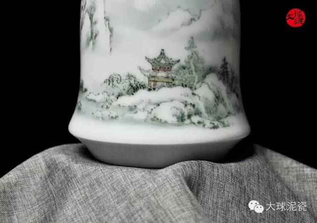 《風(fēng)花雪月》收口瓶,以大球泥為原材料,由工藝美術(shù)大師張志堅(jiān)創(chuàng)作。瓷質(zhì)潔白泛青,透露出水一般的飽滿潤(rùn)澤,造型渾厚大方,圓渾穩(wěn)重,給人以寧?kù)o安詳?shù)撵o態(tài)美。瓶身的畫(huà)面以山水為創(chuàng)作題材,主次分明,對(duì)比強(qiáng)烈,給人包容萬(wàn)物的和諧之美,反映出作者對(duì)大自然的無(wú)限熱愛(ài)和深厚的文化底蘊(yùn)。
