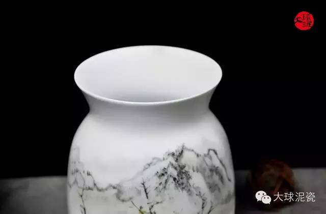 《江南春早》瓶,以大球泥為原材料,由工藝美術(shù)大師鄧劍波創(chuàng)作。作者繪畫出一場(chǎng)春雨后自然美景,山林錯(cuò)落有致,樹木生機(jī)勃勃,展現(xiàn)大自然的無限美麗風(fēng)光。