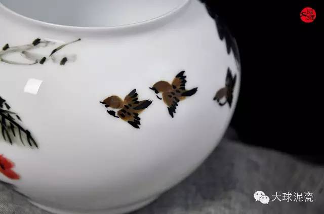 綠蔓如藤不用栽,淡青花繞竹籬開。 披衣向曉還堪愛,忽見晴蜓帶露來。 ——陳宗遠(yuǎn)·《牽;ā 作品介紹 《壯志凌云》小瓷罐,描繪著一副在深秋的傍晚,紅艷艷的牽;ㄨ簿`放的情景。瓷罐上紅艷的牽牛花和含苞的花蕾,點綴在以濃墨勾畫的枝葉藤蔓上,不僅映襯出牽;ǖ膵擅,也令畫面更具層次感。一群從遠(yuǎn)處飛來的雀鳥,使得畫面活潑生動,令人感受到在這深秋蕭瑟的景色中,仍感覺到生命的活力。 從造型上來看,《壯志凌云》小瓷罐,圓身鼓腹,沉穩(wěn)而古樸,使得整件作品顯得更為高挺,其屹立之姿威武而雄壯。而瓷罐上描繪著在深秋的傍晚,一叢叢紅艷艷的牽;ㄓL(fēng)霜露盛開,其本意為不肯屈服現(xiàn)實的殘酷,以一種獨立、堅強、自信向人們展示的豁達(dá)之美。
