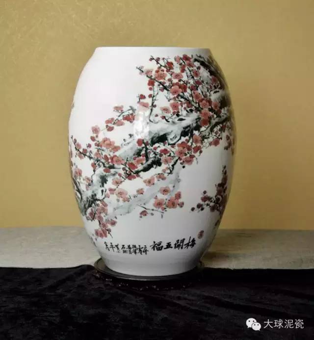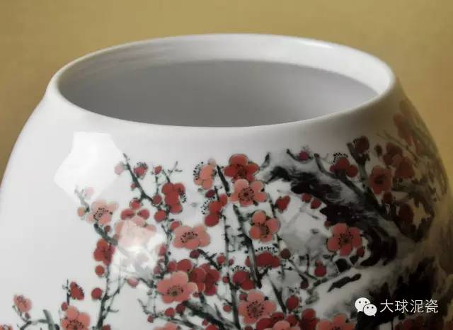 細(xì)觀此作品,運用了釉下五彩的工藝手法,圓身鼓腹,器形渾圓飽滿,線條流暢,顏色鮮艷奪目,吉祥喜慶,別有一番風(fēng)韻。畫面中的梅樹枝干盤根錯節(jié),蒼勁有力。細(xì)枝層出,短密交錯。梅花傍枝而生,層層簇簇,競相開放,好一副生機(jī)勃勃的景象。