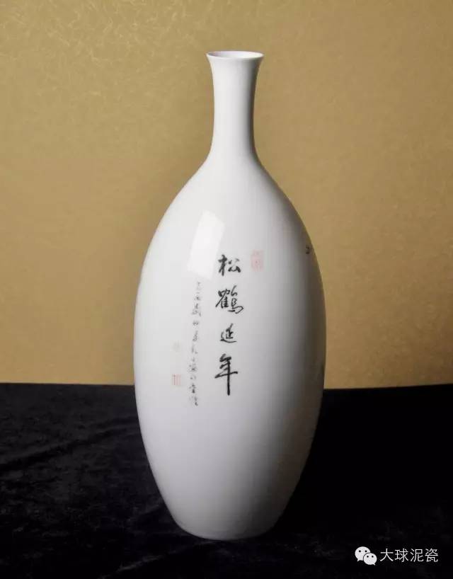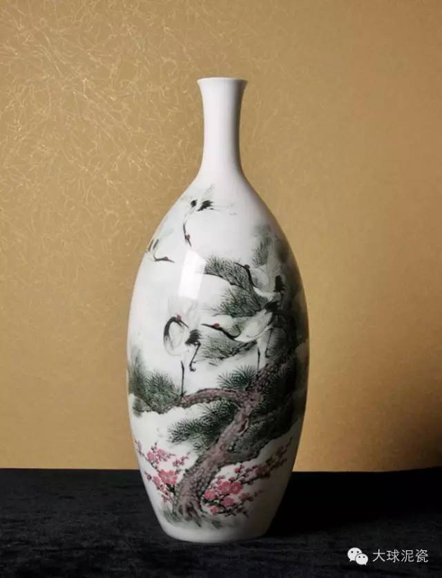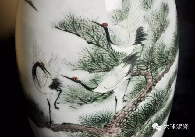 此《松鶴延年》瓶由藝美術(shù)大師孫新水先生(已故)于2005年創(chuàng)作,是其優(yōu)秀代表作品之一。采用釉下五彩的工藝,瓶高40cm,器型規(guī)整,肩、底略收,顯示出沉穩(wěn)大氣之風(fēng)。頸部拉長(zhǎng),堅(jiān)韌挺拔,提升了整個(gè)作品的氣勢(shì)和腔調(diào)。畫(huà)面中一枝勁松虬身宛轉(zhuǎn),松針茂密。枝干上立著三只仙鶴,神采飛揚(yáng),精神飽滿,栩栩如生。其窈窕而立的風(fēng)姿,宛若仙人。空中的兩只仙鶴雙翅張開(kāi),自在從容地飛翔在天空中,目光如炬,直視前方,給人一種安定、祥和的感覺(jué)。松樹(shù)旁幾株梅花開(kāi)放,顏色艷麗卻又不失雅致。整幅畫(huà)面呈現(xiàn)出一種靈活生動(dòng),淡妝濃抹總相宜的舒適感,讓人愛(ài)不釋手。
