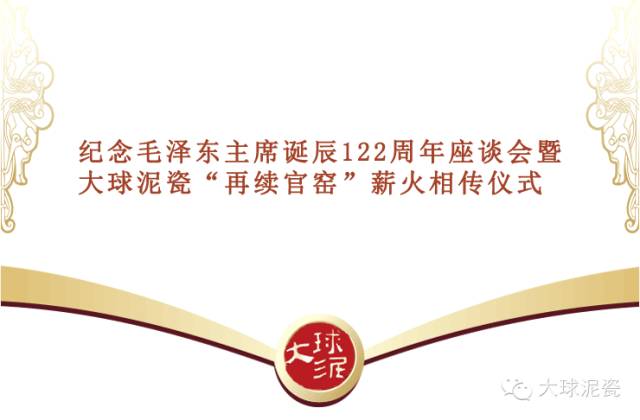 預(yù)祝湖南大球泥瓷藝有限公司“紀(jì)念毛澤東主席誕辰122周年座談會(huì)暨大球泥瓷‘再續(xù)官窯’薪火相傳儀式”取得圓滿成功。