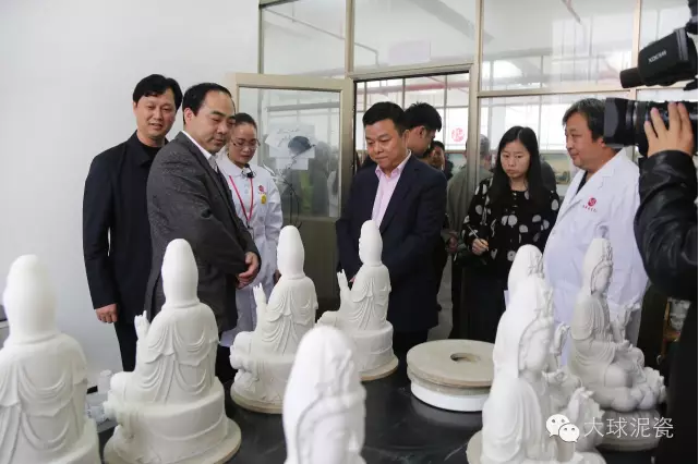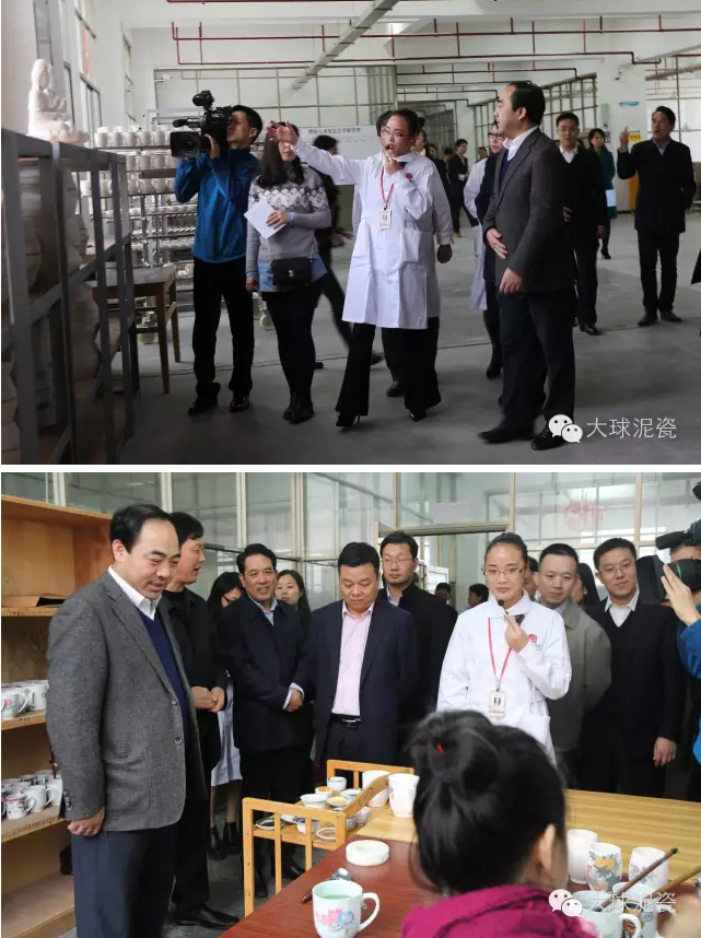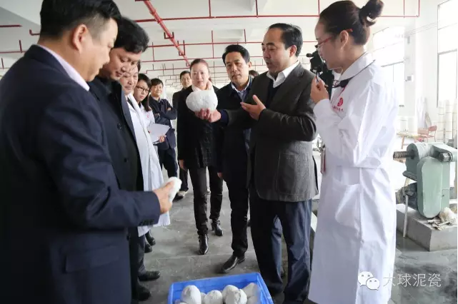 在公司董事長滕召華的陪同下,陽市長一行下車后直奔大球泥瓷生產(chǎn)、創(chuàng)作區(qū)。在大師創(chuàng)作室,陽市長詳細(xì)詢問了釉下彩的繪制工藝及創(chuàng)作靈感等,特別強(qiáng)調(diào)是否原創(chuàng)。來到練泥及制模區(qū),問到器型設(shè)計(jì)情況和大球泥原料的用量配方。陽市長對大球泥十分了解,他揀起一坨大球泥向隨行人員做起了解說:大球泥挖掘出來,就是雪白團(tuán)狀,是一種不可再生資源,現(xiàn)已枯竭。上個(gè)世紀(jì)因“毛瓷”而聲名遠(yuǎn)揚(yáng),有著厚重的歷史底蘊(yùn)。目前僅存于世的百余噸大球泥都被滕召華搶救性保護(hù)起來了,現(xiàn)在是用一坨少一坨!