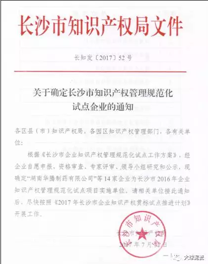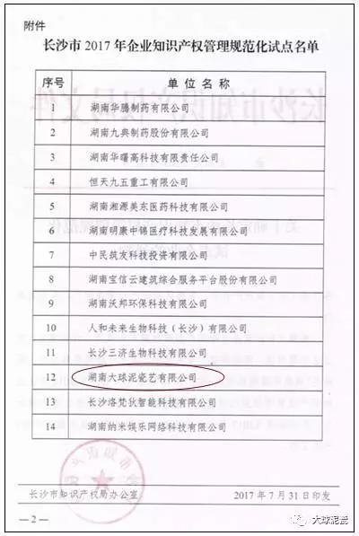 近日,長沙市知識產(chǎn)權(quán)局下發(fā)的關(guān)于確定長沙市知識產(chǎn)權(quán)管理規(guī)范化試點企業(yè)通知,根據(jù)《長沙市知識產(chǎn)權(quán)管理規(guī)范化試點工作方案》,經(jīng)企業(yè)自愿申報、資格審查、專家評審、領(lǐng)導小組研究和公示,確定以“湖南大球泥瓷藝有限公司”等14家企業(yè)為2016年企業(yè)知識產(chǎn)權(quán)規(guī)范化試點項目實施單位。