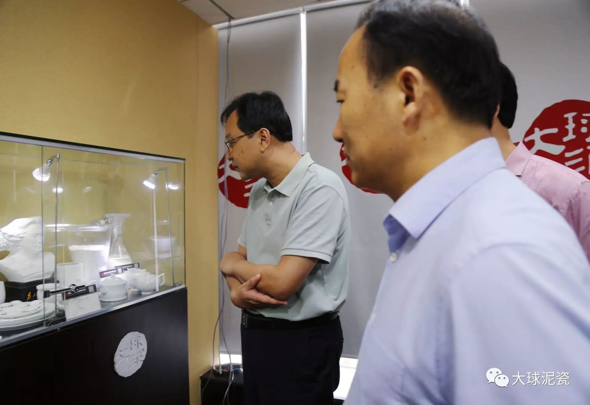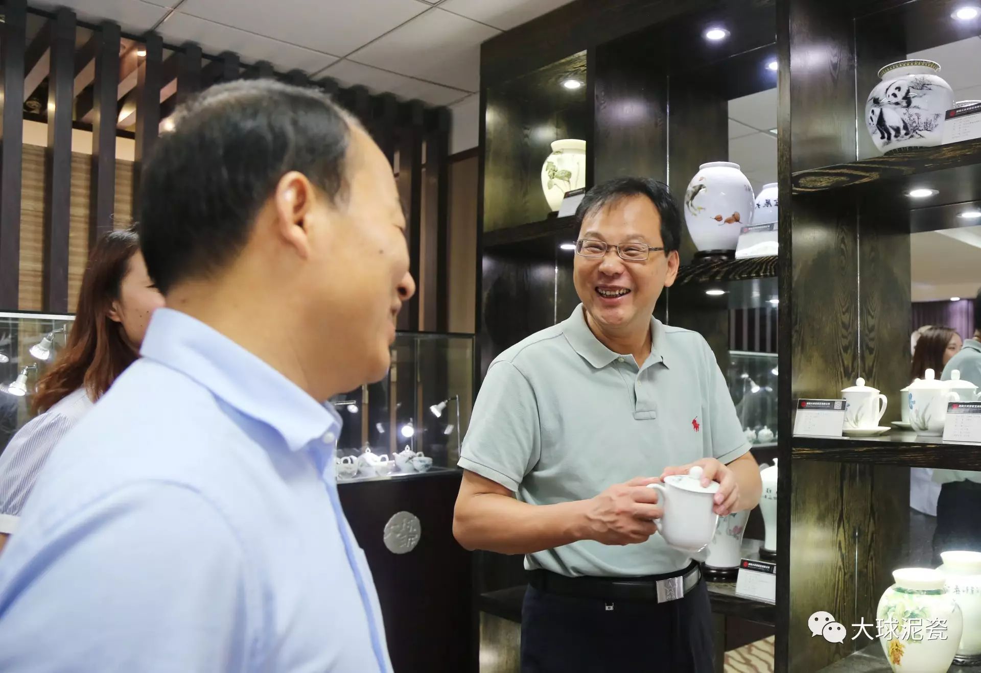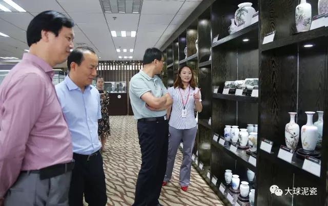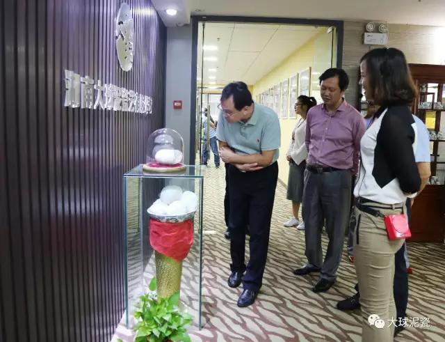 程主任、高部長一行在滕董的陪同下參觀了大球泥瓷精品展廳,仔細聽取了工作人員對大球泥原料的形成、發(fā)現(xiàn)、存量以及大球泥瓷各種器型、工藝、畫面特點的介紹。
