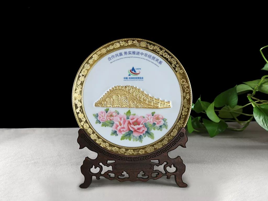《友誼金橋》以珍稀大球泥為核心原料,運(yùn)用中國非物質(zhì)文化遺產(chǎn)高溫釉下彩工藝,采用浮雕、鎏金、啞光等多項(xiàng)技藝,經(jīng)1400℃高溫、三次燒制而成,并以瓷盤為表現(xiàn)形式,圓型的瓷盤符合中國傳統(tǒng)文化中的“中庸之道”,也寓意著圓滿和諧。取各國花卉做紋飾,以浮雕金鑲邊;浮雕多孔拱橋則鎏金裝飾,以釉下彩中國國花牡丹烘托,以橋梁象征友誼,牡丹象征繁榮,寓意中非兩地友誼天長地久,同時(shí),它也作為國禮瓷在首屆中國-非洲經(jīng)貿(mào)博覽會(huì)上被贈(zèng)予各國元首。