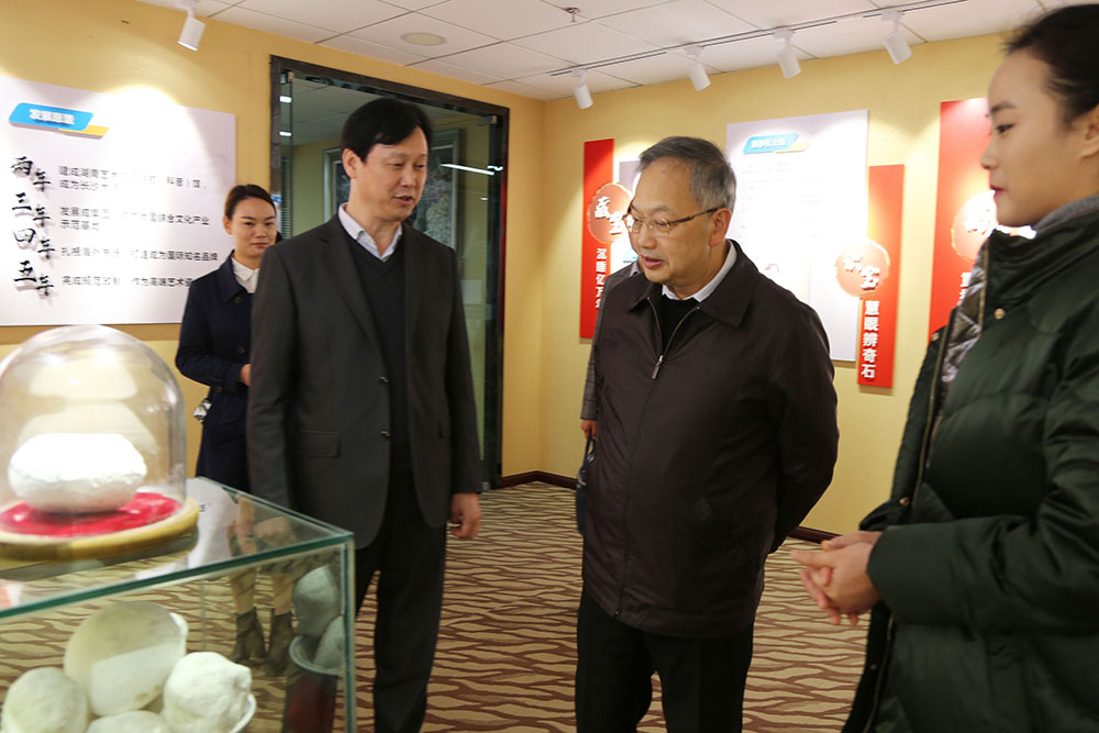 在滕召華董事長的陪同下,王主任一行參觀了大球泥瓷藝的企業(yè)文化展廳和經(jīng)典作品展廳。常務(wù)副總張萍詳細(xì)介紹了公司核心競爭力——大球泥原料及研發(fā)歷程,公司團(tuán)隊(duì)和企業(yè)文化,知識產(chǎn)權(quán)和設(shè)計理念,經(jīng)典作品與產(chǎn)品系列。 王主任看到大球泥原料樣品時,提到大球泥原料那么稀缺應(yīng)該可以人工合成,滕董解說道:七年前和工程院院士何繼善、邱冠中做個研討,這種原料是燕山時期巖漿侵入地表時逐步形成的,一是要有偉晶巖礦帶,二是要有地殼運(yùn)動,三是要有風(fēng)化條件。陶瓷是三元配方,人工合成泥料制作的瓷和大球泥原料制作的瓷會有本質(zhì)區(qū)別,其溫潤通透用對比方法就顯而易見。 來到產(chǎn)品展示廳,看到眼前琳瑯滿目的作品后,王主任連連發(fā)問。 “瓷器越薄才會越通透,大球泥瓷這么厚也會有這么透亮嗎?” 滕董用手電在厚度超過1厘米的浮雕瓷盤底部打光,在燈光照射下,穿透出了瓷盤表面,泛出青潤的光暈。