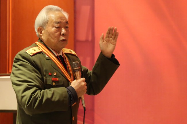 黃祖示將軍是兩彈一星的功勛,在部隊期間,年年被評為五好戰(zhàn)士,并被毛澤東主席親自接見。他感慨道,開國元勛們是人民的大救星,沒有老一輩的浴血奮斗就沒有新中國。動情之處,黃祖示將軍起身高歌——“東方紅,太陽升……”現(xiàn)場人員隨聲合唱,掌聲雷動。