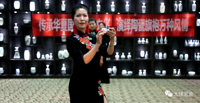 走秀的第一節(jié)目是所有佳麗們手捧大球泥瓷把玩壺作品,“捧一壺清茶,對坐笑談人生”。瓷壺非常適合作為飲茶器皿,因其質(zhì)地硬、密度高、釉面好,最能反映出茶湯的色澤,且傳熱、保溫性能適中,堪稱飲茶器皿中之珍品。通過旗袍佳人們的風(fēng)情演繹,更顯把玩壺的風(fēng)情韻味。