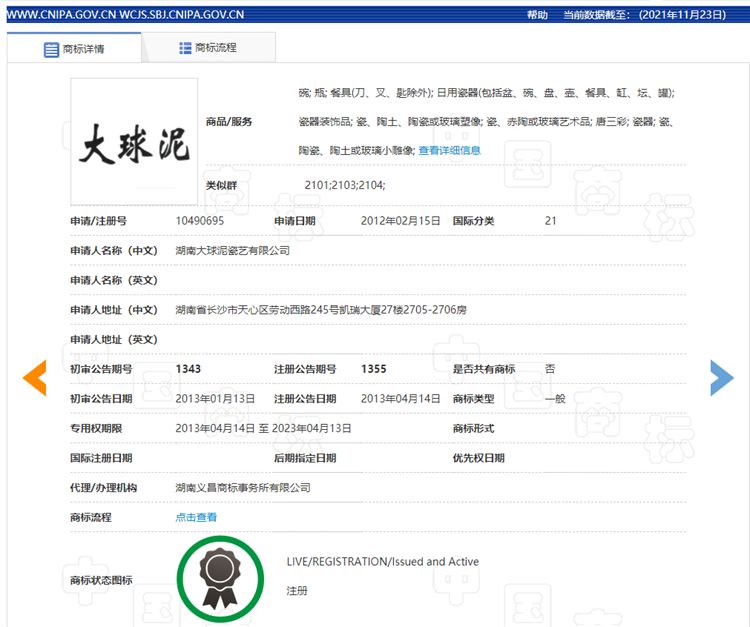 大球泥(國際分類21類)商標注冊信息