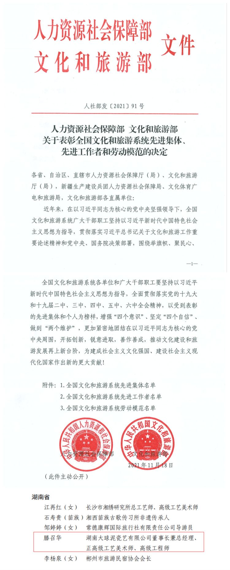 日前,國家人力資源社會(huì)保障部及國家文化和旅游部聯(lián)合印發(fā)了《全國文化和旅游系統(tǒng)先進(jìn)集體、先進(jìn)工作者和勞動(dòng)模范的決定》,公司董事長滕召華被授予“全國文化和旅游系統(tǒng)勞動(dòng)模范”稱號(hào)。這是2018年國家文化部和國家旅游局合并后的第一次評(píng)選活動(dòng),從今年1月份開始層層推選,經(jīng)過三級(jí)公示,最后評(píng)選出全國勞動(dòng)模范95位,湖南僅5位。