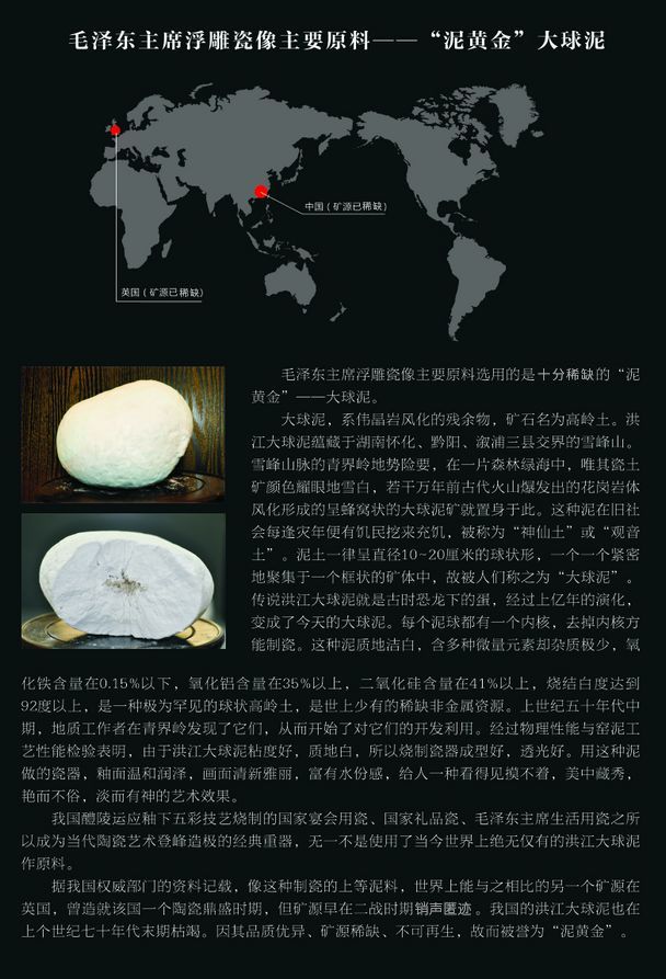 大球泥是偉晶巖風(fēng)化物,雪白球狀體,形似恐龍蛋;含鋁量極高,含鐵量極少,是制作陶瓷的稀缺原料。至今世界只發(fā)現(xiàn)兩個(gè)礦源,一個(gè)是英國,二戰(zhàn)時(shí)枯竭;一個(gè)是湖南雪峰山,上世紀(jì)八十年代枯竭。現(xiàn)存于世就一百多 噸,絕大部分被大球泥瓷藝公司搶救性保護(hù)收藏,并審慎研究、開發(fā)、利用。